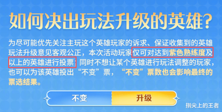 以前玩家投票,可以任意选择,不乏有一些比较随意的玩家把票给了自己从不关心的英雄,所以这次新增了一个小门槛,你只能给打到紫色熟练度及以上的英雄进行投票。